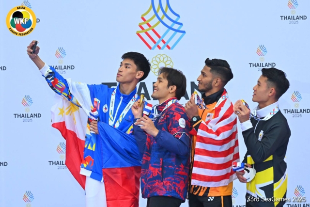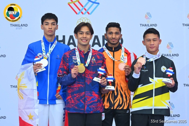 “กล้า” ศิวกร หมึกทอง นักกีฬาคาราเต้หน้าหล่อขวัญใจสาวๆ มืออันดับ 16 ของโลก โชว์ฟอร์มสมราคาแชมป์เอเชีย ปล่อยหมัดเข้าเป้าในช่วงท้าย คว้าเหรียญทอง คาราเต้ ประเภทต่อสู้ (Kumite) รุ่น 60 กิโลกรัม ชาย เอาชนะคู่แข่งจากฟิลิปปินส์ไปได้แบบสุดมันส์