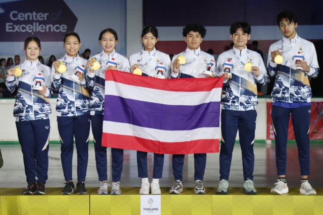 ทีมช็อตแทรคสปีดสเก็ตติ้งทีมชาติไทย ช่วยกันเร่งสปีดสุดแรง ก่อนทะยานเข้าเส้นชัยเป็นอันดับ 1 ด้วยเวลา 2.54.442 นาที คว้าเหรียญทองไปครอง ในการแข่งขันสปีดสเก็ตติ้ง ทีมผสม มหกรรมกีฬาซีเกมส์ ครั้งที่ 33 “ไทยแลนด์2025” ที่ศูนย์การค้าอิมพีเรียล เวิลด์ สำโรง เมื่อวันพฤหัสบดีที่ 18 ธันวาคม 2568 ส่วนเหรียญเงิน เป็นของ อินโดนีเซีย และสิงคโปร์ เหรียญทองแดง