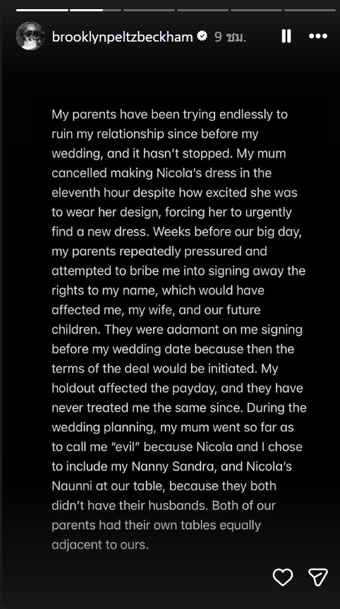 "บรูคลิน เบ็คแฮม" โพสต์ผ่านสื่อโซเชียลร่ายยาว ประกาศไม่ขอคืนดีกับทั้ง "เดวิด-วิกตอเรีย" ครอบครัวเบ็คแฮม