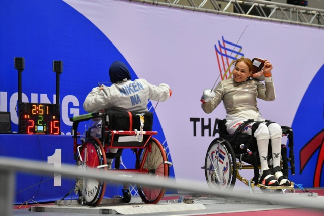 "แวว" สายสุนีย์ จ๊ะนะ เจ้าของ 5 เหรียญทองพาราลิมปิกเกมส์ (3 เหรียญทองประวัติศาสตร์จากฟันดาบ 3 ประเภท ฟอยล์-เอเป้-เซเบอร์ ในพาราลิมปิกเกมส์ ปารีส 2024) ไม่พลาดเอาชนะ ไนเกน นักกีฬาจากอินโดนีเซีย 15-2 คะแนน คว้าเหรียญทองเพิ่มให้กับทัพนักกีฬาไทย