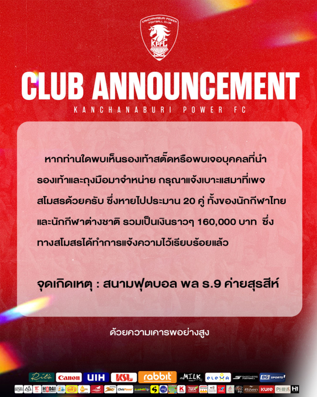 หากท่านใดพบเห็นรองเท้าสตั๊ดหรือพบเจอบุคคลที่นำรองเท้าและถุงมือมาจำหน่าย กรุณาแจ้งเบาะแสมาที่เพจสโมสรด้วยครับ ซึ่งหายไปประมาน 20 คู่ ทั้งของนักกีฬาไทย และนักกีฬาต่างชาติ รวมเป็นเงินราว ๆ 160,000 บาท ซึ่งทางสโมสรได้ทำการแจ้งความไว้เรียบร้อยแล้ว