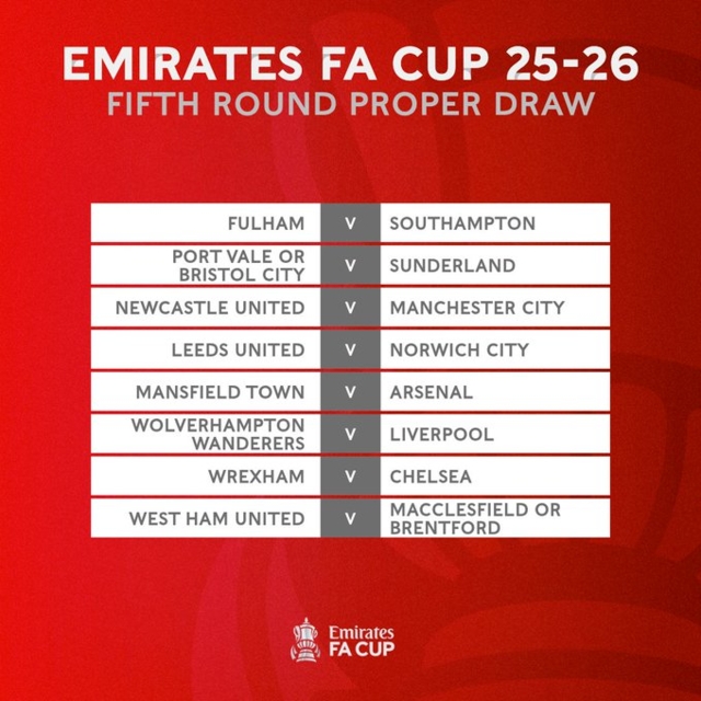 สำหรับผลจับสลาก "เอฟเอคัพ" รอบ 5 มีดังนี้