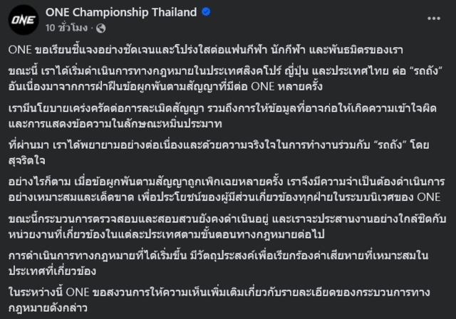 โดยมีข้อความระบุว่า ONE ขอเรียนชี้แจงอย่างชัดเจน และโปร่งใสต่อแฟนกีฬา นักกีฬา และพันธมิตรของเรา