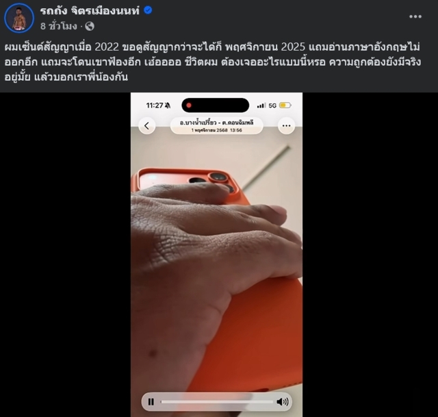 พร้อมแคปชั่นระบุว่า “ผมเซ็นสัญญาเมื่อ 2022 ขอดูสัญญากว่าจะได้ก็พฤศจิกายน 2025 แถมอ่านภาษาอังกฤษไม่ออกอีก แถมจะโดนเขาฟ้องอีก เฮ้ออออ ชีวิตผม ต้องเจออะไรแบบนี้หรอ ความถูกต้องยังมีจริงอยู่มั้ย แล้วบอกเราพี่น้องกัน”