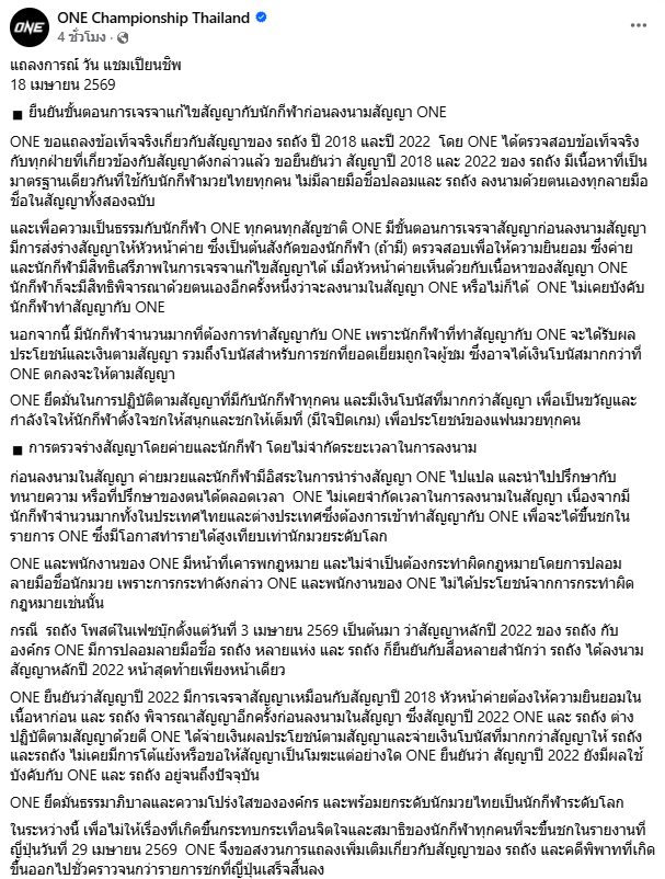 (18 เม.ย. 2569) เฟซบุ๊กเพจ ONE Championship Thailand ได้ออกแถลงการณ์ล่าสุด เกี่ยวกับประเด็นดรามา "รถถัง จิตรเมืองนนท์" โดย "ยืนยันขั้นตอนการเจรจาแก้ไขสัญญากับนักกีฬาก่อนลงนามสัญญา ONE" โดยเป็นการออกแถลงการณ์ก่อนที่ "รถถัง" จะแถลงเปิดใจกับสื่อมวลชนในวันเดียวกัน