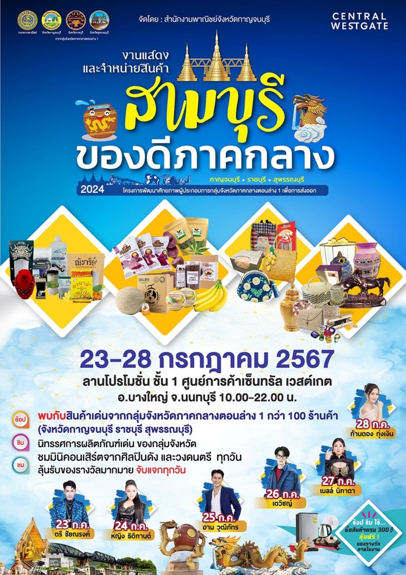 งานสุดยิ่งใหญ่ กับสุดยอดสินค้าของดีภาคกลาง คัดสรร งานแสดงและจำหน่ายสินค้า กลุ่มจังหวัดภาคกลางตอนล่าง 1 (กาญจบุรี, ราชบุรี, สุพรรบุรี) ยกทัพสินค้าระดับพรีเมี่ยม มาให้ชาวนนทบุรี ได้เลือกชม ชิม ช้อป ในงาน “สามบุรี ของดีภาคกลาง” ระหว่าง วันที่ 23 - 28 กรกฎาคม 2567 ณ ลานโปรโมชั้น ชั้น 1 ศูนย์การค้าเซ็นทรัล เวสต์เกต อ.บางใหญ่ จ.นนทบุรี ภายในงานพบกับสินค้าเด่น กลุ่มจังหวัดภาคกลางตอนล่าง 1 (กาญจบุรี, ราชบุรี, สุพรรบุรี)