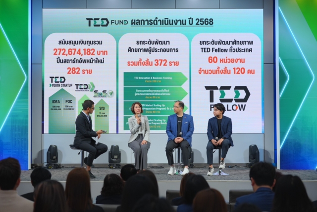 นายวันนี นนท์ศิริ ผู้ตรวจราชการกระทรวงการอุดมศึกษา วิทยาศาสตร์ วิจัยและนวัตกรรม ในฐานะได้รับมอบหมายจากปลัดกระทรวง อว. ให้ปฏิบัติหน้าที่ประธานกรรมการบริหารกองทุนฯ เปิดเผยว่า กระทรวง อว. ได้กำหนดทิศทางการดำเนินงาน โดยได้กำหนดให้ TED Fund เป็นเครื่องมือหลักในการขับเคลื่อนเศรษฐกิจนวัตกรรมไทย ผ่านกลไกสำคัญในการสนับสนุนทุน และส่งเสริมการพัฒนานวัตกรรมและเทคโนโลยี เพื่อยกระดับศักยภาพสตาร์ทอัพ และ SMEs ในการสร้างมูลค่าเพิ่มทางเศรษฐกิจ โดยปีงบประมาณ 2568 นี้ กองทุนฯ ประสบความสำเร็จเป็นอย่างดี ด้วยผลงานการสนับสนุนเงินทุนสำหรับกลุ่มยุววิสาหกิจเริ่มต้น (Youth Startup) และการขยายตลาดและธุรกิจของกลุ่มผู้ประกอบการเทคโนโลยีและนวัตกรรม (TMS: TED Market Scaling Up) รวมไปถึงโครงการพัฒนาภาคเอกชนเพื่อการยกระดับระบบนิเวศการสร้างผู้ประกอบการอย่างยั่งยืน (SfS: Startups for Startups) เกิดสตาร์ทอัพรวมจำนวน 282 ราย ผ่านเงินทุนสนับสนุนรวมกว่า 272 ล้านบาท ครอบคลุม 13 กลุ่มอุตสาหกรรมเป้าหมาย