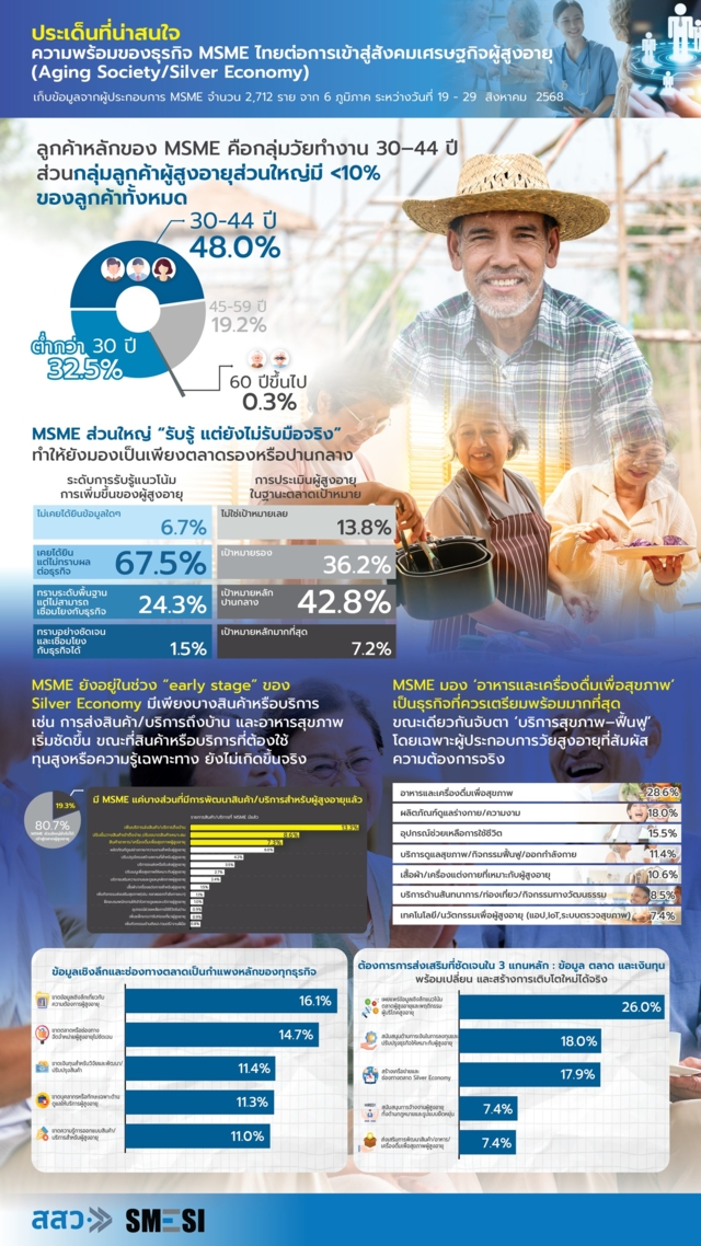 นางสาวปณิตา ชินวัตร รองผู้อำนวยการรักษาการแทนผู้อำนวยการสำนักงานส่งเสริมวิสาหกิจขนาดกลางและขนาดย่อม เปิดเผยผลสำรวจความคิดเห็นผู้ประกอบการ SME เกี่ยวกับความพร้อมของธุรกิจต่อการเข้าสู่สังคมผู้สูงอายุ (Aging Society/Silver Economy) โดยเก็บข้อมูลจากผู้ประกอบการ SME จำนวน 2,712 ราย จาก 6 ภูมิภาค ระหว่างวันที่ 19–29 สิงหาคม 2568 พบว่า ปัจจุบัน SME เริ่มมีการจ้างงานผู้สูงอายุเฉลี่ยอยู่ที่ร้อยละ 11 โดยเฉพาะภาคธุรกิจการเกษตรมีสัดส่วนการจ้างงานสูงสุดอยู่ที่ร้อยละ 17 และธุรกิจขนาดกลางมีแนวโน้มจ้างงานผู้สูงอายุมากกว่าธุรกิจรายย่อย (Micro) ซึ่งส่วนหนึ่งมาจากโครงสร้างการจ้างงานของธุรกิจ ซึ่งลักษณะงานของผู้สูงอายุมักเป็นงานที่ใช้ประสบการณ์และทักษะเฉพาะ แม้มีข้อจำกัดด้านสุขภาพและความทันสมัยของทักษะ เช่น งานบริการลูกค้า งานฝีมือ/งานช่าง เป็นต้น แต่กว่าร้อยละ 70 ของผู้ประกอบการที่จ้างงานผู้สูงอายุอยู่แล้ว ยังคงจ้างงานต่อไปในอนาคต