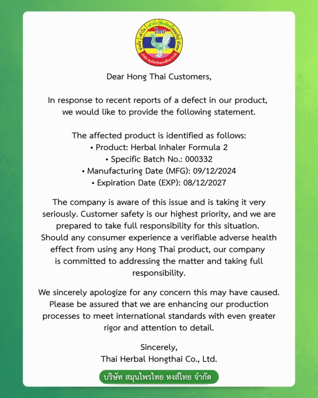 Hong Thai Herbal Co., Ltd. would like to respectfully inform all consumers that, according to the official announcement issued by the Food and Drug Administration (FDA) of Thailand regarding substandard herbal products — specifically the production batch No. 000332 (Manufactured on December 9, 2024 – Expiry Date: December 8, 2027) — a total of 200,000 units (16,666 dozens) were involved in this batch.