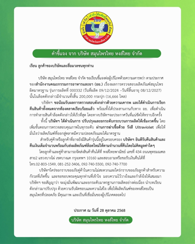 บริษัท สมุนไพรไทย หงส์ไทย จำกัด ขอเรียนชี้แจงต่อผู้บริโภคด้วยความเคารพว่า ตามประกาศของสำนักงานคณะกรรมการอาหารและยา (อย.) เรื่องผลการตรวจสอบผลิตภัณฑ์สมุนไพรผิดมาตรฐาน รุ่นการผลิตที่ 000332 (วันที่ผลิต 09/12/2024 –วันที่สิ้นอายุ 08/12/2027) นั้นในล็อตดังกล่าวมีจำนวนทั้งสิ้น 200,000 กระปุก (16,666 โหล)