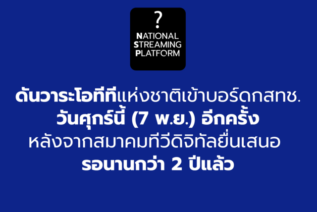 แหล่งข่าวในสมาคมโทรทัศน์ระบบดิจิตอล(ประเทศไทย) เปิดเผยว่าในการประชุม คณะกรรมการกิจการกระจายเสียง กิจการโทรทัศน์ และกิจการโทรคมนาคมแห่งชาติ (กสทช.) วัน ศุกร์ที่ 7 พ.ย.นี้ ทราบว่าได้มีการบรรจุวาระพิจารณาเห็นชอบผลการศึกษาแนวทางที่เป็นไปได้ และ เหมาะสมในการจัดให้มีช่องทางการเข้าถึงกิจการโทรทัศน์ภาคพื้นดินบนแพลตฟอร์มดิจิทัล หรือ (National Streaming Platform) ที่ได้เคยเสนอเข้าวาระที่ประชุมบอร์ดกสทช.มาตั้งแต่ประมาณ เดือนตุลาคม 2566 แต่ยังไม่มีการพิจารณา