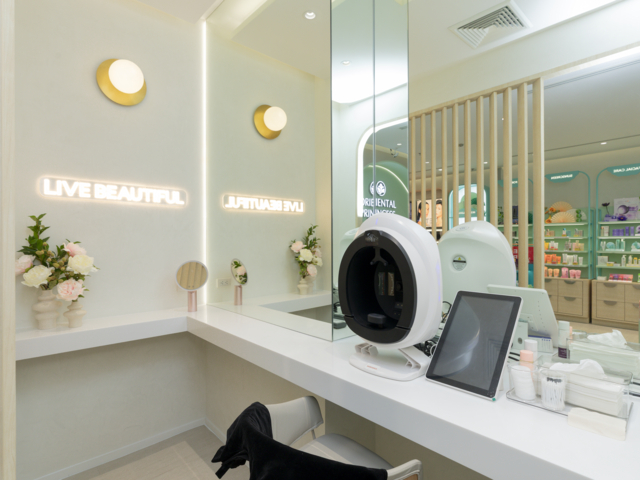 อีกหนึ่งไฮไลต์ของสาขานี้คือ ห้อง Skincare Expert Consulting Room พื้นที่บริการพิเศษสำหรับลูกค้าคนสำคัญ มาพร้อมเทคโนโลยีวิเคราะห์ผิวขั้นสูงด้วยระบบ AI Skin Analyzer ซึ่งสามารถตรวจวิเคราะห์ผิวได้ลึกถึงระดับชั้นใต้ผิวภายในเวลาเพียง 5–10 นาที ผ่านระบบกล้อง AI และเทคโนโลยีสเปกตรัมแสง 8 ชนิด มอบผลที่แม่นยำระดับสากล พร้อมให้คำแนะนำผลิตภัณฑ์ที่เหมาะสมกับสภาพผิวเฉพาะบุคคล เพื่อให้ลูกค้าได้เลือกผลิตภัณฑ์ที่ตอบโจทย์ ตรงจุด เพื่อผลลัพธ์ที่ดีที่สุด สะท้อน Vision ของแบรนด์ ที่มุ่งส่งมอบพลังความงามจากธรรมชาติ และเป็นอีกก้าวของการยกระดับประสบการณ์การช้อปปิ้งในยุคใหม่ของ Oriental Princess ทุกองค์ประกอบของร้านตั้งใจสร้างความงามที่ยั่งยืน เพื่อให้ทุกคนดูดีในแบบของตัวเองอย่างมั่นใจ และมีส่วนร่วมในการดูแลโลกไปพร้อมกัน