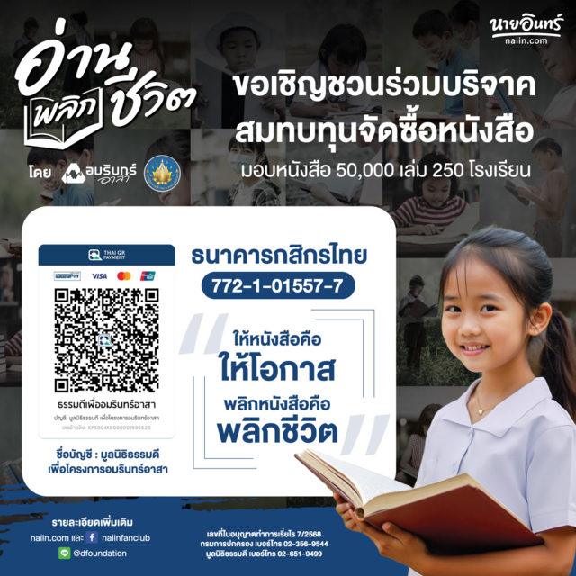 บริษัท อมรินทร์ บุ๊ค เซ็นเตอร์ จำกัด ขอเชิญชวนประชาชนร่วมสนับสนุนโครงการ “อ่านพลิกชีวิต” โครงการเพื่อสาธารณประโยชน์ที่จัดทำขึ้นเพื่อส่งเสริมวัฒนธรรมการอ่านและยกระดับการเข้าถึงแหล่งความรู้สำหรับชุมชน วัด และโรงเรียนที่ขาดแคลนทั่วประเทศ