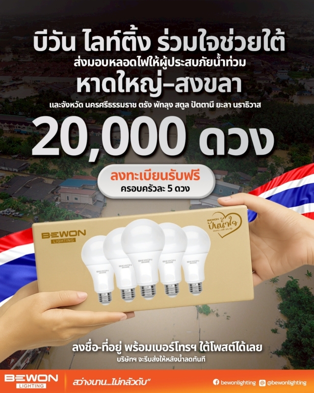 💡🧡 “BEWON ร่วมใจช่วยใต้ ส่งหลอดไฟให้ผู้ประสบภัยน้ำท่วมในหาดใหญ่–สงขลา และพื้นที่ใกล้เคียงจังหวัด นครศรีธรรมราช ตรัง พัทลุง สตูล ปัตตานี ยะลา นราธิวาส