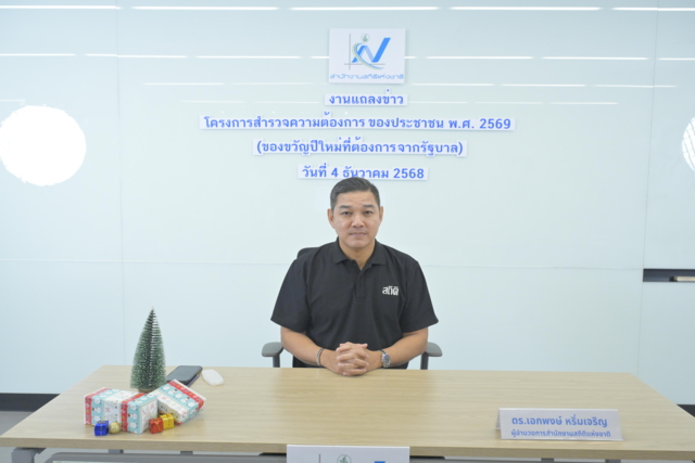 ดร.เอกพงษ์ หริ่มเจริญ ผู้อำนวยการสำนักงานสถิติแห่งชาติ เปิดเผยว่า “สำนักงานสถิติแห่งชาติ ดำเนินการสำรวจความต้องการของประชาชน พ.ศ. 2569 (ของขวัญปีใหม่ที่ต้องการจากรัฐบาล) ระหว่างวันที่ 18 - 23 พฤศจิกายน 2568” สรุปผลที่น่าสนใจได้ดังนี้