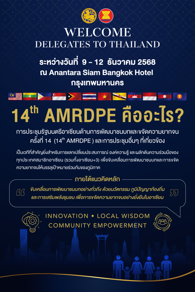 ไทยพร้อมต้อนรับอาเซียน! ร่วมสร้างโอกาส ยกระดับคุณภาพชีวิต และขจัดความยากจนอย่างยั่งยืน ผ่านนวัตกรรม ภูมิปัญญาท้องถิ่น และการเสริมพลังชุมชน Innovation – Local Wisdom – Community Empowerment ในงานการประชุมรัฐมนตรีอาเซียนด้านการพัฒนาชนบทและขจัดความยากจน ครั้งที่ 14 (14th AMRDPE) และการประชุมอื่นที่เกี่ยวข้อง ระหว่างวันที่ 9 – 12 ธันวาคม 2568 ณ โรงแรมอนันตรา สยาม กรุงเทพฯ