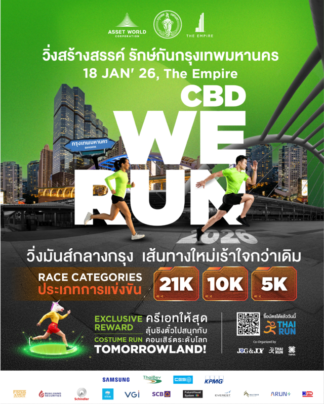 CBD WE RUN 2026 งานวิ่งที่รวมทั้งเส้นทางใหม่ รางวัลใหญ่ และค่าสมัครสุดคุ้ม เพื่อเปิดพื้นที่ให้คนเมืองทุกไลฟ์สไตล์ได้ขยับร่างกายและร่วมดูแลเมืองที่รักไปพร้อมกัน ปีนี้มาพร้อมไฮไลต์พิเศษ Costume Run ให้ผู้ร่วมวิ่งได้ปล่อยพลังความสร้างสรรค์ พร้อมลุ้นรับบัตรคอนเสิร์ตระดับโลก Tomorrowland ตอบโจทย์ทั้งสายสุขภาพ สายกรีน และนักวิ่งสายจริงจังที่พร้อมพิชิตทุกเส้นชัย บนเส้นทางใจกลาง CBD กรุงเทพฯ ที่ออกแบบมาเพื่อสร้างประสบการณ์ใหม่ให้กับนักวิ่ง โดยเฉพาะผู้สนใจสามารถสมัครได้แล้ววันนี้ – 15 มกราคม 2569 ที่ https://race.thai.run/cbdwerun2026