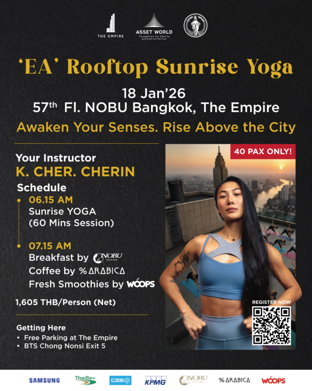 วิ่งเสร็จมาโยคะต่อ กับ Where YOGA meets World-Class Breakfast. Wake up higher than the city เริ่มต้นเช้าวันใหม่เหนือเส้นขอบฟ้า กับกิจกรรม ‘EA’ Rooftop Sunrise Yoga บนชั้น 57 ณ Nobu Bangkok, ‘EA’ Rooftop at The Empire นำคลาสโดย K. Cher Cherin Founder & Instructor แห่ง Pavanar Yoga Studio & Wellness Center และ Brand Ambassador ของ lululemon ที่จะพาคุณสัมผัสโยคะยามเช้า รับแสงอาทิตย์ขึ้น ชมวิวเมืองกรุงเทพฯ แบบ 360 องศา พร้อม Breakfast Experience สุดพิเศษ รับจำกัดเพียง 40 คน ราคา 1,605 บาท/คน สมัครได้ที่ https://forms.gle/i6wSYuKqdbeTHH568
