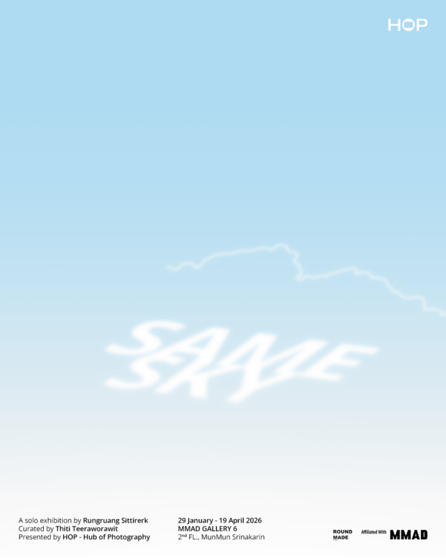 · HOP Hub of Photography นำเสนอ SAME SKY A solo exhibition by Rungruang Sittirerk รุ่งเรือง สิทธิฤกษ์ นิทรรศการที่ชวนมองท้องฟ้าเป็นพื้นที่ร่วมของผู้คน ไม่ว่าความเชื่อ ภูมิหลัง หรือประสบการณ์จะต่างกันเพียงใด เราทุกคนต่างมองเห็น “ท้องฟ้า” และต่างบรรจุเรื่องราวของตัวเองลงไปในนั้น
