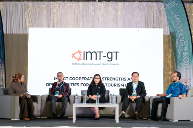 โดยเมื่อวันที่ 17 มกราคม 2569 เวลา 15.30–16.30 น. ได้มีการจัดเสวนาในหัวข้อ “IMT-GT as a Dreamed Destination for Quality Yacht Experience” โดยผู้แทนจากหน่วยงานด้านการท่องเที่ยวและโครงสร้างพื้นฐานของประเทศสมาชิก IMT-GT ร่วมเสนอวิสัยทัศน์ จุดแข็ง และโอกาสในการพัฒนาการท่องเที่ยวทางทะเลภายใต้กรอบความร่วมมือ IMT-GT พร้อมเน้นย้ำบทบาทของประเทศไทยในการเป็นศูนย์กลางเชื่อมโยงการท่องเที่ยวทางทะเลของภูมิภาค ร่วมกับอินโดนีเซียและมาเลเซีย ได้แก่ Mr. Amri Bukhairi Bakhtiar, Director, Centre for the Indonesia-Malaysia-Thailand Growth Triangle (CIMT), Mr. Saut F. Siagian, SVP Marketing & Business Development, PT. Pelabuhan Indonesia (Pelindo) และ Mr. Mohd Ashrul Ashraf Mohd Noor, Deputy Director, Package Development Division, Tourism Malaysia ได้ร่วมแลกเปลี่ยนวิสัยทัศน์ จุดแข็ง และโอกาสของการพัฒนาการท่องเที่ยวทางทะเลเชื่อมโยงสามประเทศ เพื่อผลักดันความร่วมมือให้เกิดความต่อเนื่องและเป็นรูปธรรมในระยะต่อไป โดยมี นางรุ่งทิพย์ บุกขุนทด ผู้อำนวยการกองเลขานุการและวิเทศสัมพันธ์ ททท. ร่วมถ่ายทอดทิศทางความร่วมมือระหว่างประเทศและบทบาทของประเทศไทยในการขับเคลื่อนการท่องเที่ยวทางทะเลภายใต้กรอบ IMT-GT