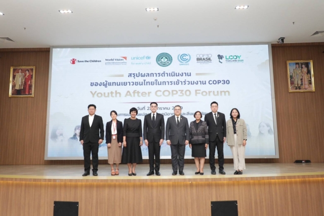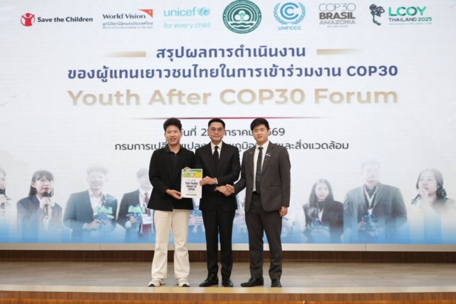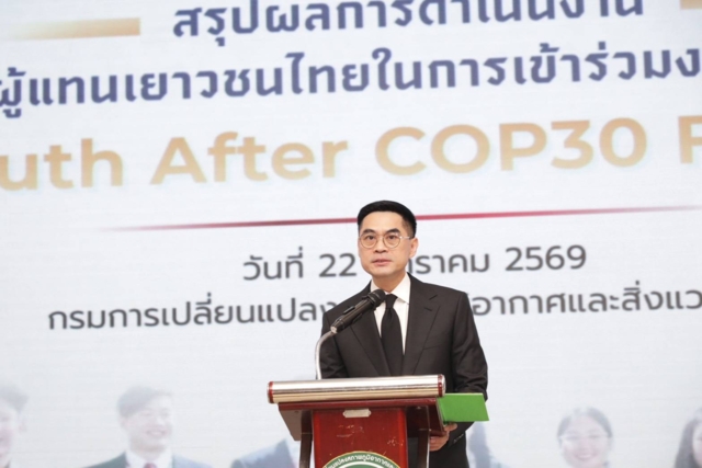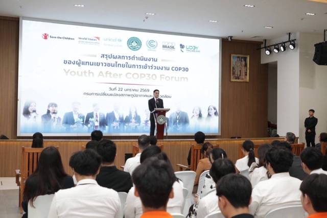 วันที่ 22 มกราคม 2568 กรมการเปลี่ยนแปลงสภาพภูมิอากาศและสิ่งแวดล้อม กระทรวงทรัพยากรธรรมชาติและสิ่งแวดล้อม จัดงานสรุปผลการดำเนินงานของผู้แทนเยาวชนไทยในการเข้าร่วมงาน COP30 หรือ Youth After COP30 Forum สะท้อนมุมมองเยาวชนไทยในการขับเคลื่อนการดำเนินงานด้านการเปลี่ยนแปลงสภาพภูมิอากาศ โดยมี ดร.พิรุณ สัยยะสิทธิ์พานิช อธิบดีกรมการเปลี่ยนแปลงสภาพภูมิอากาศและสิ่งแวดล้อม เป็นประธานเปิดงาน พร้อมรับมอบรายงาน Thai Youths Report At COP30ซึ่งมีผู้แทนเยาวชนไทยที่เข้าร่วมงานประชุมรัฐภาคีกรอบอนุสัญญาสหประชาชาติว่าด้วยการเปลี่ยนแปลงสภาพภูมิอากาศ สมัยที่ 30 (COP30) และผู้แทนจากเครือข่ายเด็กและเยาวชนต่างๆ ที่ขับเคลื่อนงานด้านการเปลี่ยนแปลงสภาพภูมิอากาศและสิ่งแวดล้อม รวมถึงผู้แทนจากหน่วยงานภาคีความร่วมมือต่างๆ เข้าร่วมงานกว่า 120 คน ณ ห้องประชุมอารีย์สัมพันธ์ อาคารกรมการเปลี่ยนแปลงสภาพภูมิอากาศและสิ่งแวดล้อม กรุงเทพฯ