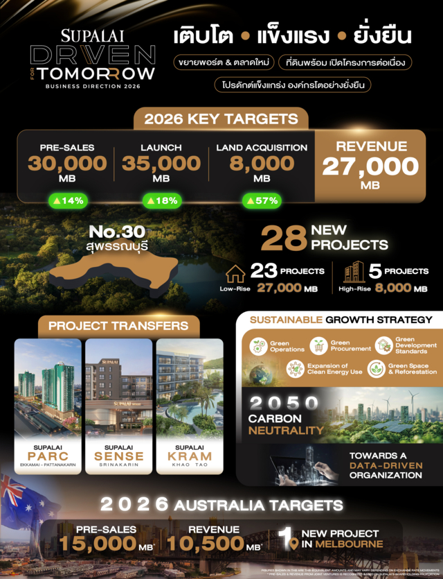 บมจ.ศุภาลัย ประกาศทิศทางธุรกิจปี 2569 ภายใต้แนวคิด Driven for Tomorrow ท่ามกลางเศรษฐกิจที่ยังขยายตัวในกรอบจำกัด พร้อมเดินหน้าธุรกิจอย่างมั่นคง ควบคู่การเติบโตอย่างยั่งยืน ผ่านการพัฒนาโครงการในทำเลและรูปแบบที่สอดคล้องกับกำลังซื้อของตลาด ตั้งเป้ายอดขายรวมทั้งในประเทศไทยและออสเตรเลียปี 2569 มูลค่า 45,000 ล้านบาท* พร้อมแผนเปิดโครงการใหม่ 28 โครงการ มูลค่า 35,000 ล้านบาท พร้อมลุยสุพรรณบุรีและเกาะสมุย เดินหน้าสร้างฐานรายได้ให้สมดุลมากขึ้นผ่านธุรกิจต่างประเทศ โดยเฉพาะตลาดอสังหาฯ ออสเตรเลียที่ปี 2568 เติบโตกว่า 370% พร้อมรุกธุรกิจคลังสินค้าให้เช่า ควบคู่ยกระดับองค์กรด้วย Data Driven และกรอบ Sustainability Driven มุ่งสู่ Carbon Neutrality ปี 2050