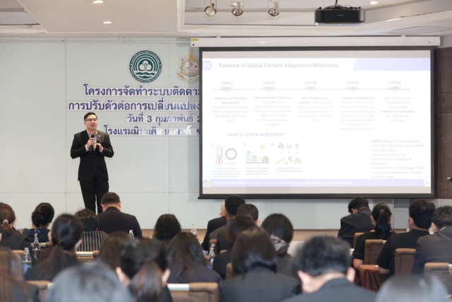 วันที่ 3 กุมภาพันธ์ 2569 กระทรวงทรัพยากรธรรมชาติและสิ่งแวดล้อม (ทส.) โดย กรมการเปลี่ยนแปลงสภาพภูมิอากาศและสิ่งแวดล้อม (สส.) จัดประชุมนำเสนอ “โครงการจัดทำระบบติดตามประเมินผลการปรับตัวต่อการเปลี่ยนแปลงสภาพภูมิอากาศ” เพื่อยกระดับกลไกการติดตามประเมินผลการดำเนินงานด้านการปรับตัวของประเทศไทยให้มีประสิทธิภาพ สอดคล้องกับเป้าหมายการปรับตัวระดับโลก และรองรับการรายงานในระดับนานาชาติ โดยมีนายปวิช เกศววงศ์ รองอธิบดีกรมการเปลี่ยนแปลงสภาพภูมิอากาศและสิ่งแวดล้อม เป็นประธาน ในพิธีเปิด พร้อมด้วย นางสาวระเบียบ ภูผา ผู้อำนวยการกองขับเคลื่อนการปรับตัวต่อการเปลี่ยนแปลงสภาพภูมิอากาศ กล่าวรายงาน โดยมีผู้เข้าร่วมจากหน่วยงานรายสาขาและผู้ที่เกี่ยวข้อง ทั้งในห้องประชุม และผ่านระบบออนไลน์ รวมกว่า 250 คน ณ โรงแรมมิราเคิล แกรนด์ คอนเวนชั่น กรุงเทพมหานคร