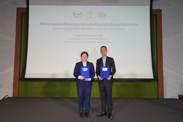 กองทุนเงินให้กู้ยืมเพื่อการศึกษา (กยศ.) ร่วมกับธนาคารจิตอาสา โดยการสนับสนุนของ สสส. จัดพิธีลงนามบันทึกข้อตกลงความร่วมมือด้านการดำเนินงานจิตสาธารณะ เพื่อส่งเสริมให้นักเรียน นักศึกษาที่เป็นผู้กู้ยืมเงิน สามารถเข้าร่วมกิจกรรมจิตสาธารณะได้อย่างหลากหลาย โดยมี ดร.นันทวัน วงศ์ขจรกิตติ ผู้จัดการกองทุนเงินให้กู้ยืมเพื่อการศึกษา และ นายธีระพล เต็มอุดม ผู้อำนวยการธนาคารจิตอาสา ร่วมลงนามในบันทึกข้อตกลงความร่วมมือ ณ ห้องประชุม 201 อาคารศูนย์เรียนรู้สุขภาวะ สำนักงานกองทุนสนับสนุน การสร้างเสริมสุขภาพ (สสส.)
