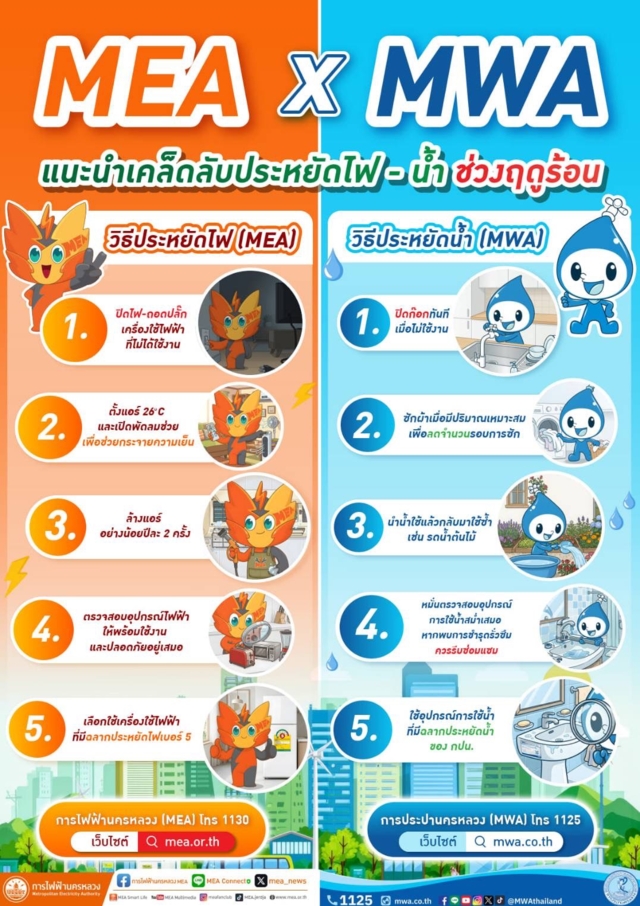 MEA หรือ การไฟฟ้านครหลวง ร่วมกับ MWA หรือ การประปานครหลวง ในฐานะหน่วยงานรัฐวิสาหกิจสังกัดกระทรวงมหาดไทย มีหน้าที่ดูแลความมั่นคงระบบไฟฟ้า และประปา ในพื้นที่กรุงเทพมหานคร นนทบุรี และสมุทรปราการ แนะแนวทางบริหารจัดการพลังงานในภาคครัวเรือนช่วงฤดูร้อน เน้นย้ำการปรับเปลี่ยนพฤติกรรมใช้ไฟฟ้าอย่างถูกวิธีตามนโยบายรัฐบาล เพื่อลดภาระค่าใช้จ่ายและช่วยชาติประหยัดพลังงานอย่างยั่งยืน