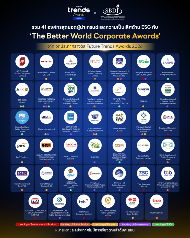 และนี่คือรายชื่อ 41 องค์กรที่ได้รับรางวัล ‘The Future Corporate Awards’ จากเวที Future Trends Awards 2026 (ไม่มีการเรียงตามลำดับคะแนน)