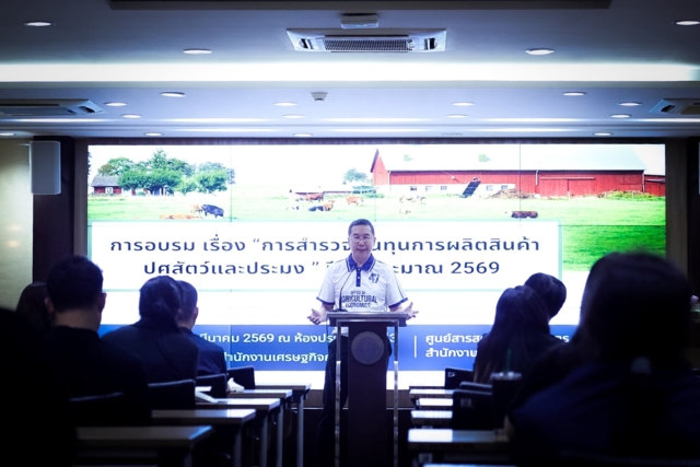 ในการขับเคลื่อนภารกิจเพื่อมุ่งสู่เป้าหมายดังกล่าว สศก. ได้จัดอบรมเชิงปฏิบัติการเรื่อง “การสำรวจต้นทุนการผลิตสินค้าปศุสัตว์และประมง” ระหว่างวันที่ 12 – 13 มีนาคม 2569 เพื่อให้เจ้าหน้าที่ทั้งในส่วนกลางและส่วนภูมิภาคได้รับองค์ความรู้และทักษะในการจัดทำข้อมูลที่ถูกต้องแม่นยำตามหลักวิชาการ โดยมุ่งเน้นความเชี่ยวชาญในการทวนสอบข้อมูลหน้างานให้สะท้อนข้อเท็จจริง เพื่อให้ได้สารสนเทศที่มีคุณภาพส่งต่อถึงมือเกษตรกรและผู้ใช้ประโยชน์ทุกภาคส่วน ซึ่งการอบรมครั้งนี้ มีการให้ความรู้ในหัวข้อที่สำคัญเกี่ยวกับการสำรวจต้นทุนและปริมาณการผลิตสินค้าปศุสัตว์และประมง ปี 2569 ประกอบด้วย ระเบียบวิธีการสำรวจข้อมูลสินค้ากุ้งขาวแวนนาไม ไก่ไข่และไข่ไก่ เกลือทะเล ศูนย์รวบรวมน้ำนมดิบและโคนม รวมถึงการสำรวจราคาปัจจัยการผลิตและปริมาณการผลิตไก่เนื้อและปลากะพง โดยอาศัยศิลปะในการซักถามและจรรยาบรรณในการวิจัยเพื่อให้ได้ข้อมูลที่สะท้อนขีดความสามารถในการแข่งขันของประเทศอย่างแท้จริง