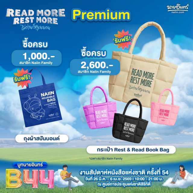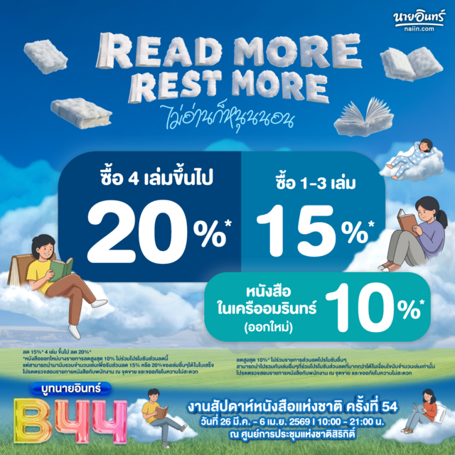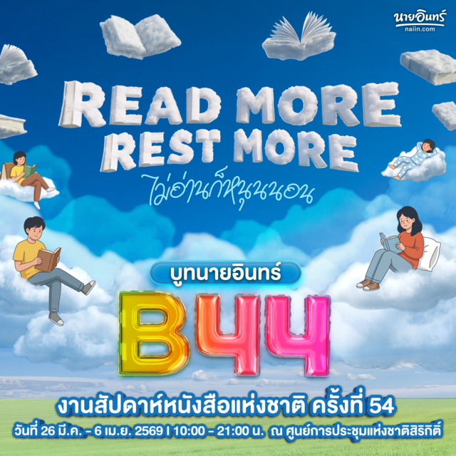 ปีนี้บูทนายอินทร์มาพร้อมธีม "Read more. Rest more. ไม่อ่านก็หนุนนอน" เพราะเราเชื่อว่าหนังสือดีทุกเล่มมีคุณค่าในแบบของตัวเอง ไม่ว่าคุณจะตั้งใจมาอ่านให้จบทุกหน้า หรือแค่อยากหยิบปกสวยขึ้นมาดมกลิ่นกระดาษแล้วหลับตาลงไป นายอินทร์ยินดีต้อนรับนักอ่านเสมอ แล้วมาปล่อยใจไปกับพวกเราได้ที่บูทนายอินทร์ B44 ในงาน งานสัปดาห์หนังสือแห่งชาติ ครั้งที่ 54