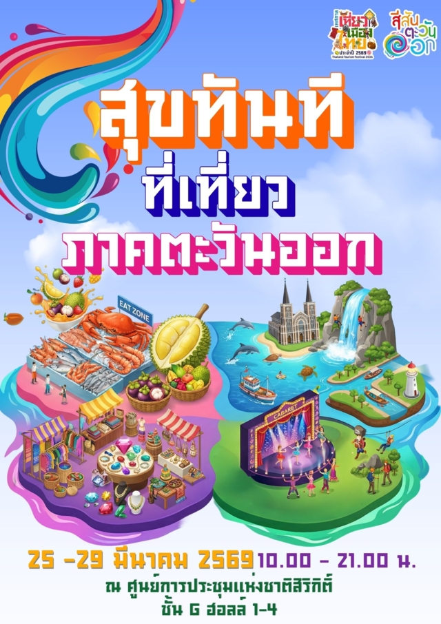 ททท. ภูมิภาคภาคตะวันออก ขอเชิญชวนนักท่องเที่ยว มาร่วมสัมผัสประสบการณ์ “สุขทันที ที่เที่ยวภาคตะวันออก” ในงานเทศกาลเที่ยวเมืองไทย ครั้งที่ 44 วันที่ 25 – 29 มีนาคม 2569 ณ ศูนย์ประชุมแห่งชาติสิริกิติ์ ฮอลล์ 1-4 แล้วคุณจะค้นพบว่า…ความสุขของการเดินทาง อยู่ใกล้กว่าที่คิด