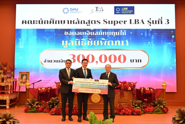 ภายหลังเสร็จสิ้นพิธีมอบประกาศนียบัตร ยังมีพิธีมอบเงินสนับสนุนให้แก่ มูลนิธิชัยพัฒนา โดย ดร.สุเมธ ตันติเวชกุล เป็นผู้รับมอบ โดย ดร.สุทธิพล ทวีชัยการ คณบดีคณะนิติศาสตร์ปรีดี พนมยงค์ DPU และประธานกรรมการหลักสูตร Super LBA รุ่นที่ 2 นายสุชัย พรชัยศักดิ์อุดม ประธานกรรมการนักศึกษาหลักสูตร SUPER LBA รุ่นที่ 2 และคณะนักศึกษาหลักสูตร Super LBA รุ่นที่ 2 ร่วมบริจาคสมทบ ทำให้ยอดรวมเงินบริจาคทั้งสิ้น 845,222 บาท