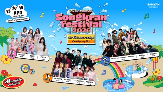 SAMYAN MITRTOWN SONGKRAN FESTIVAL 2026 เปิดสถานีสาดความสนุก 13 - 15 เม.ย. 69 ตั้งแต่เวลา 14.00 – 19.00 น. ยืนหนึ่งสงกรานต์เปียกฉ่ำอย่างต่อเนื่อง ในคอนเซ็ปต์ “เปียกให้สุด สนุกให้ฉ่ำ” สนุกสุดเหวี่ยงแบบโนแอล ผนึกพาร์ตเนอร์ดังยึดหัวหาดความมันส์จัดเต็ม อุโมงค์น้ำความยาวกว่า 100 เมตร ฟรีคอนเสิร์ตจากศิลปินดังกว่า 40 ชีวิต!! และกิจกรรมอีกมากมาย