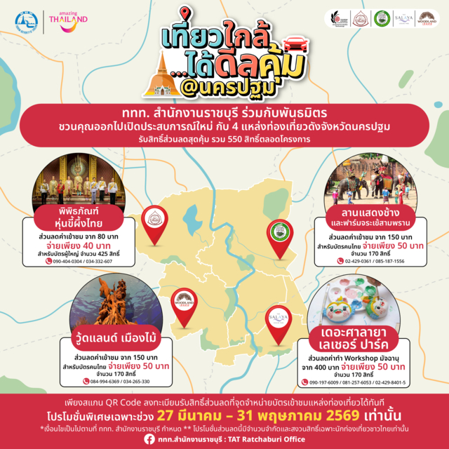 ใครกำลังมองหาทริปใกล้กรุงเทพฯ แบบไปง่าย คุ้มค่า และได้ประสบการณ์ใหม่ ห้ามพลาดกับแคมเปญ “เที่ยวใกล้ ได้ดีลคุ้ม @ นครปฐม” ที่ชวนทุกคนออกไปเปิดทริปสนุกใกล้กรุง พร้อมรับสิทธิพิเศษส่วนลดสุดคุ้มจาก 4 แหล่งท่องเที่ยวชื่อดังของจังหวัดนครปฐม ผ่านการสแกน QR Code ลงทะเบียนรับสิทธิ์ ได้ง่าย ๆ
