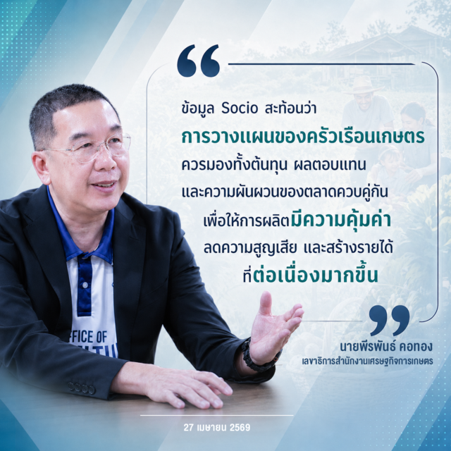 เลขาธิการ สศก. กล่าวเพิ่มเติมว่า ในเชิงนโยบาย ข้อมูล Socio สามารถใช้เป็นฐานสำคัญในการออกแบบมาตรการช่วยเหลือเกษตรกรให้ตรงจุดมากขึ้น ทั้งการลดต้นทุน การพัฒนาบริการทางการเกษตร การส่งเสริมเทคโนโลยีที่เหมาะสมกับพื้นที่ การยกระดับทักษะแรงงานเกษตร และการสนับสนุนการรวมกลุ่ม เพื่อให้ครัวเรือนเกษตรรับมือกับความผันผวนของเศรษฐกิจ ตลาด และต้นทุนการผลิตได้อย่างยั่งยืน ซึ่งข้อมูล Socio ชี้ให้เห็นว่า การยกระดับรายได้ของเกษตรกรในระยะต่อไป ไม่ได้ขึ้นอยู่กับการผลิตให้มากขึ้นเพียงอย่างเดียว แต่ต้องผลิตให้คุ้มขึ้น ใช้ทรัพยากรให้แม่นยำขึ้น ลดความสูญเสีย และบริหารรายได้ให้มีความต่อเนื่องมากขึ้น ทั้งนี้ สศก. อยู่ระหว่างดำเนินการสำรวจข้อมูลต่อเนื่องในปีเพาะปลูก 2568/69 ในพื้นที่ 74 จังหวัด จำนวน 7,600 ครัวเรือน เพื่อให้ได้ข้อมูลที่ทันสมัยและเป็นฐานข้อมูลสำคัญในการกำหนดนโยบายเกษตรของประเทศต่อไป