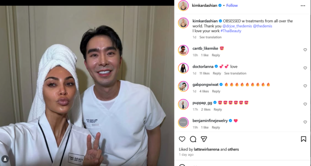 โดย Kim K ได้โพสต์ลงบนอินสตาแกรมส่วนตัวว่า “OBSESSED w treatments from all over the world” พร้อมแท็กขอบคุณ @drjoe_thedemis และ @thedemis แถมยังติดแฮชแท็ก #ThaiBeauty