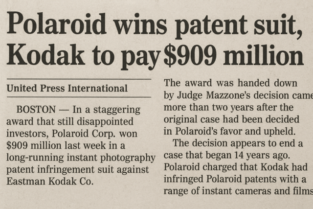 ในช่วงปี 1976 Kodak เริ่มจำหน่ายกล้องถ่ายภาพอินสแตนท์ของตัวเอง อย่าง Kodak EK4 และ EK6 หลังจากวางขายได้ไม่กี่เดือนในเดือนเมษายน 1976 Polaroid ยืนฟ้อง Kodak โดยแย้งว่าเลียนแบบเทคโนโลยีของตนเอง ทําให้เค้าสูญเสียกําไรและส่วนแบ่งตลาดมูลค่าถึง 12,000 ล้านดอลลาร์ จนในปี 1986 ศาลได้สั่งให้ Kodak ยุติการผลิตและการจำหน่ายผลิตภัณฑ์ หลังจากสู้คดีกันนานหลายปีในที่สุดในปี 1991 Kodak ถูกสั่งให้จ่ายเงินชดเชยให้กับ Polaroid เป็นจํานวน 909 ล้านดอลลาร์ ซึ่งถือเป็นค่าเสียหายจากการละเมิดสิทธิบัตรที่ใหญ่ที่สุดในประวัติศาสตร์สหรัฐฯ ณ เวลานั้น