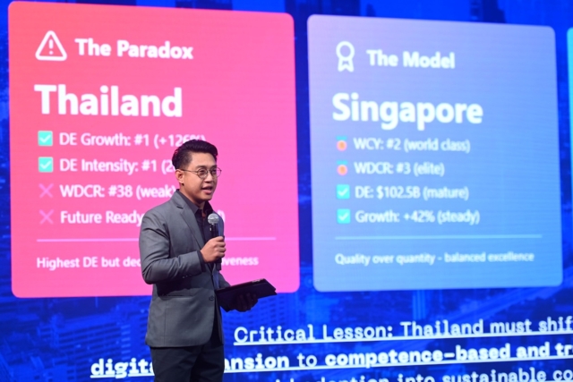 ดร.ศุภสัณห์ ปรีดาวิภาต คณบดี คณะการสร้างเจ้าของธุรกิจสร้างสรรค์ มหาวิทยาลัยหอการค้าไทย ชี้ให้เห็นปัญหาว่า ประเทศไทยเข้าถึงอินเทอร์เน็ตและแพลตฟอร์มมากเป็นอันดับต้นๆ ของภูมิภาค และมีผู้ประกอบการเพิ่มมากขึ้นทุกปี แต่สิ่งที่ประเทศไทยขาด คือ ‘คุณภาพของการเติบโต’ เพราะเศรษฐกิจดิจิทัลของประเทศไทยโตจากปริมาณการใช้เทคโนโลยี ไม่ได้โตจากความสามารถในการใช้เทคโนโลยี ซึ่งเสี่ยงสิ่งนี้เรียกว่า “Thailand’s Digital Paradox” เป็นปรากฏการณ์ที่ประเทศมีการพัฒนาเศรษฐกิจดิจิทัลอย่างรวดเร็ว แต่ความสามารถเชิงโครงสร้างและความโปร่งใสในการใช้ข้อมูลยังก้าวตามไม่ทัน