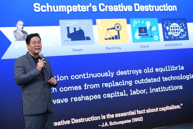 ทฤษฎี Creative Destruction ถูกขยายความต่อเป็นผลงานที่คว้ารางวัลโนเบลสาขาเศรษฐศาสตร์ในปี 2025 นี้ ซึ่ง ดร.ธีรข์กรณ์บอกว่า ผลงานโนเบลปีนี้บอกกับเราว่า โลกเรากำลังเปลี่ยนผ่านเข้าสู่โลกที่ดิจิทัลและความสามารถในการแข่งขันจะเป็นต้นทุนใหม่ของเศรษฐกิจดิจิทัล ดังนั้น อนาคตไม่ได้ขึ้นอยู่กับว่าเราพัฒนานวัตกรรมและเทคโนโลยีได้เร็วแค่ไหน แต่อยู่ที่ว่าสังคมเรียนรู้และปรับตัวได้มากน้อยแค่ไหน