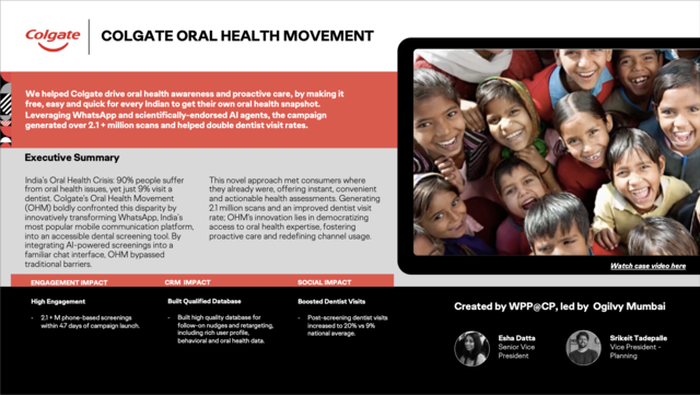 อินเดียกำลังเผชิญวิกฤตสุขภาพช่องปาก ด้วย 90% ของประชากรมีปัญหาช่องปาก แต่มีเพียง 9% เท่านั้นที่ไปพบทันตแพทย์ Colgate จึงริเริ่มโครงการ Oral Health Movement (OHM) เพื่อลดช่องว่างนี้ ผ่านการเปลี่ยน WhatsApp แอปสื่อสารยอดนิยมของอินเดีย ให้กลายเป็นเครื่องมือคัดกรองสุขภาพช่องปากที่เข้าถึงง่าย