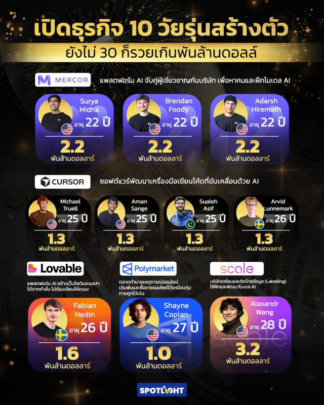 อีกหนึ่งชื่อที่โดดเด่นคือ Alexandr Wang วัย 28 ปี ผู้ร่วมก่อตั้ง Scale AI บริษัทด้านการติดป้ายข้อมูลเพื่อฝึกโมเดล AI ตั้งแต่ปี 2559 ร่วมกับ Lucy Guo โดยแม้ทั้งคู่จะแยกทางกันในปี 2561 แต่ Wang ยังคงพาบริษัทเติบโตต่อเนื่อง จน Meta เข้าซื้อหุ้น 49% ของ Scale ด้วยมูลค่าราว 1.4 หมื่นล้านดอลลาร์ พร้อมดึงตัวเขาไปนั่งตำแหน่งประธานเจ้าหน้าที่ฝ่าย AI ดีลนี้ทำให้ Wang กลายเป็นมหาเศรษฐีที่ร่ำรวยที่สุดในกลุ่มอายุต่ำกว่า 30 ปี ด้วยทรัพย์สินกว่า 3.2 พันล้านดอลลาร์