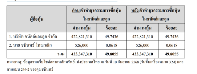 ทั้งนี้ ข้อมูลดังกล่าวอ้างอิงจากเว็บไซต์ตลาดหลักทรัพย์แห่งประเทศไทย ณ วันที่ 10 กันยายน 2568 ซึ่งเป็นวันขึ้นเครื่องหมาย XM และเป็นไปตามแบบรายงาน 246-2 ของนายชนินทร์ โทณวณิก
