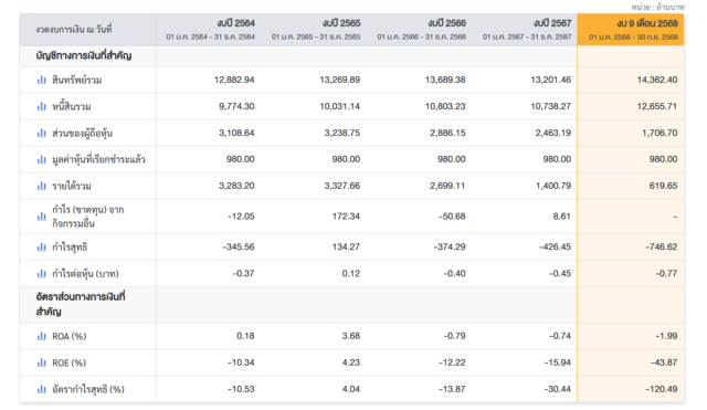 ผลลัพธ์สุดท้ายคือกำไรสุทธิที่ผันผวนและส่วนใหญ่ติดลบ บริษัทขาดทุนสุทธิ 345.6 ล้านบาทในปี 2564 พลิกมามีกำไร 134.3 ล้านบาทในปี 2565 ก่อนจะกลับมาขาดทุนหนักอีกครั้งในปี 2566 ที่ 374.3 ล้านบาท และขาดทุนเพิ่มเป็น 426.5 ล้านบาทในปี 2567 ที่น่ากังวลที่สุดคือในงบ 9 เดือนปี 2568 บริษัทขาดทุนสุทธิถึง 746.6 ล้านบาท ซึ่งสูงกว่าการขาดทุนทั้งปีของปีก่อนอย่างมีนัยสำคัญ และสะท้อนแรงกดดันที่เร่งตัวขึ้นในช่วงสั้น