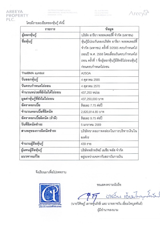 วันที่ 12 มกราคม 2568 บริษัท อารียา พรอพเพอร์ตี้ จำกัด (มหาชน) ทำหนังสือชี้แจงต่อตลาดหลักทรัพย์แห่งประเทศไทย กรณีสมาคมตลาดตราสารหนี้ไทย (ThaiBMA) ขึ้นเครื่องหมาย DP (Default Payment) กับหุ้นกู้ของบริษัท 2 รุ่น ได้แก่ รุ่น A257A และรุ่น A250A หลังบริษัทไม่สามารถชำระดอกเบี้ยงวดวันที่ 5 มกราคม 2569 ได้ ซึ่งเข้าข่ายเหตุผิดนัดตามข้อกำหนดสิทธิของผู้ถือหุ้นกู้ ส่งผลให้ตลาดหลักทรัพย์แห่งประเทศไทยดำเนินการขึ้นเครื่องหมาย CB (Cash Balance) กับหลักทรัพย์ของบริษัทดังกล่าว