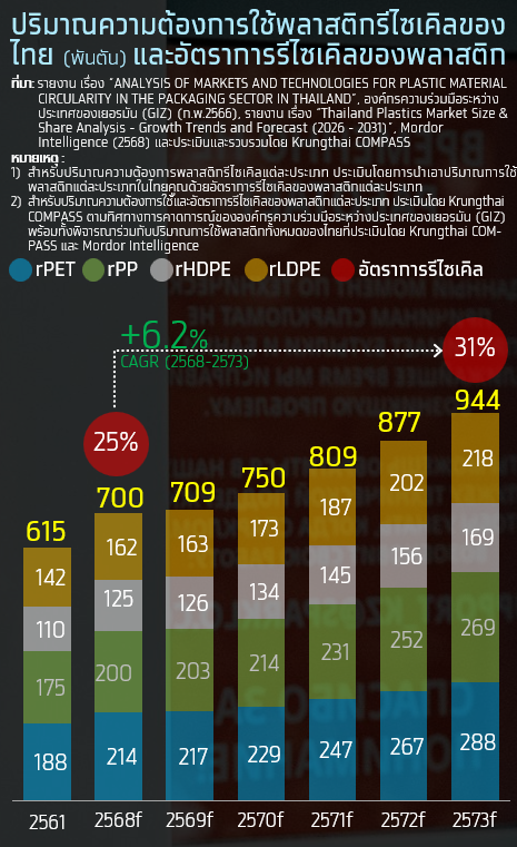Krungthai COMPASS คาดว่า ปริมาณความต้องการใช้พลาสติกรีไซเคิลของไทยจะเพิ่มจาก 700,000 ตันในปี 2568 เป็น 944,065 ตันในปี 2573 หรือเติบโตเฉลี่ยปีละ 6.2%CAGR ซึ่งส่งผลให้อัตราการรีไซเคิลของพลาสติกในไทยคาดว่าจะเพิ่มขึ้นจาก 25% ในปี 2568 เป็น 31% ในปี 2573 โดยการคาดการณ์นี้สอดคล้องกับการประเมินขององค์กรความร่วมมือระหว่างประเทศของเยอรมัน (GIZ) ซึ่งมีแรงขับเคลื่อนหลัก 4 ประการ ดังนี้