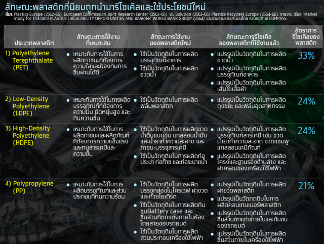 หากมองย้อนไปดูพัฒนาการในการนำเอาขยะพลาสติกกลับมาใช้ประโยชน์ ประเทศไทยมีพัฒนาการที่ดีขึ้น สะท้อนได้จากอัตราการรีไซเคิลของขยะพลาสติกที่เพิ่มขึ้นจาก 18% ในปี 2561 เป็น 25% ในปี 2568 ส่งผลให้ขยะพลาสติกราว 700,000 ตัน ถูกนำมารีไซเคิลและใช้ประโยชน์ใหม่อีกครั้ง โดยพลาสติกที่นิยมนำมารีไซเคิลใหม่มีทั้งหมด 4 ประเภท ดังนี้