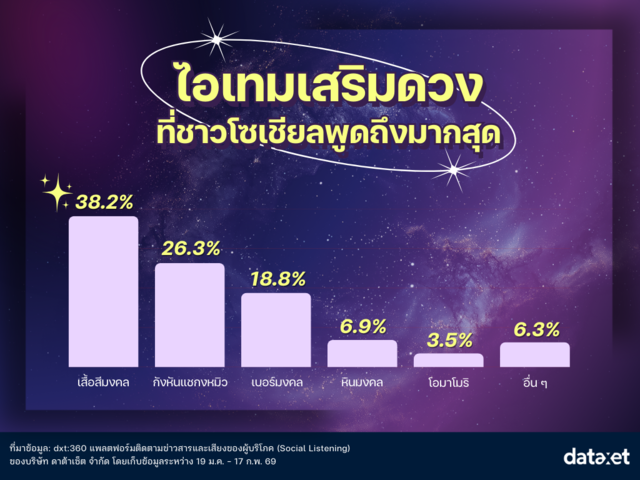 การรวบรวมบทสนทนาบนโซเชียลมีเดียผ่าน dxt:360 Social Listening พบว่าเทรนด์ความเชื่อเรื่อง ‘มูเตลู’ ได้เปลี่ยนจากการกราบไหว้ขอพรตามขนบดั้งเดิม ไปสู่การผสานความเชื่อเข้ากับไลฟ์สไตล์ผ่านของใช้และเครื่องประดับในชีวิตประจำวัน สะท้อนให้เห็นถึงพฤติกรรมของผู้บริโภคที่ต้องการเครื่องยึดเหนี่ยวจิตใจที่เข้าถึงง่ายและตอบโจทย์การใช้ชีวิต โดยพบไอเทมเสริมดวงที่ถูกพูดถึงมากที่สุด ดังนี้