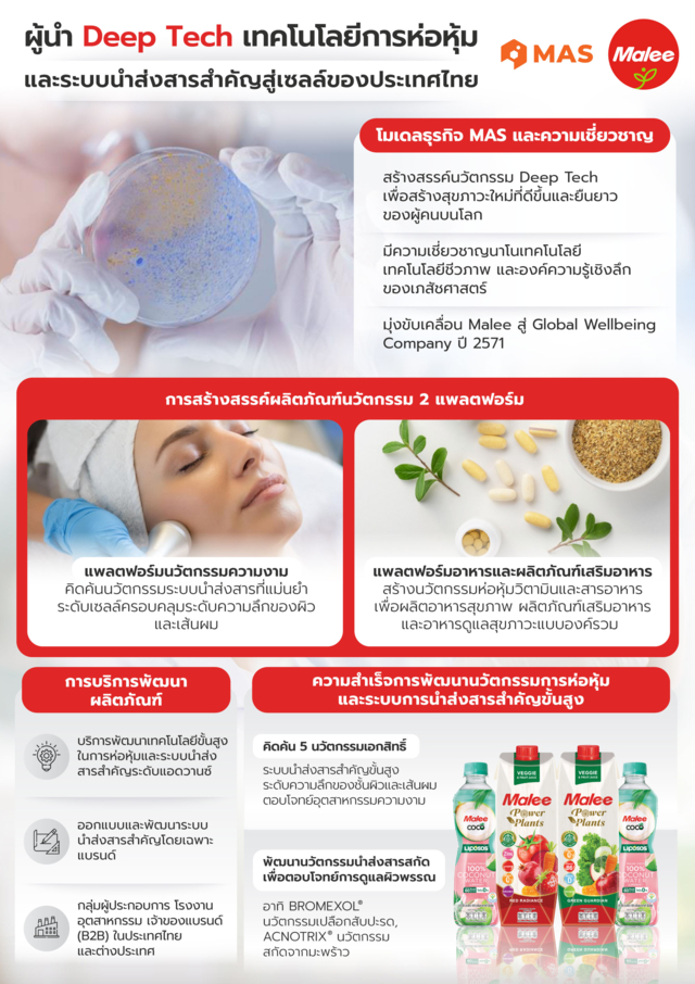 ทั้งนี้ มาลี แอพพลายด์ ไซเอ็นซ์ (MAS) เป็นผู้พัฒนาเทคโนโลยีการห่อหุ้มและระบบนำส่งสารสำคัญสู่เซลล์ (Encapsulation & Delivery System) ที่มีความเชี่ยวชาญด้านเทคโนโลยีขั้นสูง โดยใช้ Biotechnology และ Nanotechnology มาพัฒนานวัตกรรมที่ช่วยส่งมอบสารสำคัญในผลิตภัณฑ์ได้ตรงจุดในระดับเซลล์